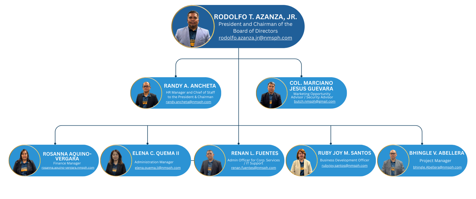 MANCOM Team (from right to left): Elena C. Quema II (Administration Manager), Rodolfo T. Azanza Jr. (President and Chairman of the Board of Directors), Rosanna Aquino-Vergara (Finance Manager), Ruby Joy M. Santos (Business Development Officer), Randy A. Ancheta (HR Manager and Chief of Staff to the President & Chairman), Bhingle V. Abellera (Project Manager), Renan L. Fuentes (Admin Officer for Corp. Services / IT Support), Col. Marciano Jesus Guevara (Marketing Opportunity Advisor / Security Advisor)